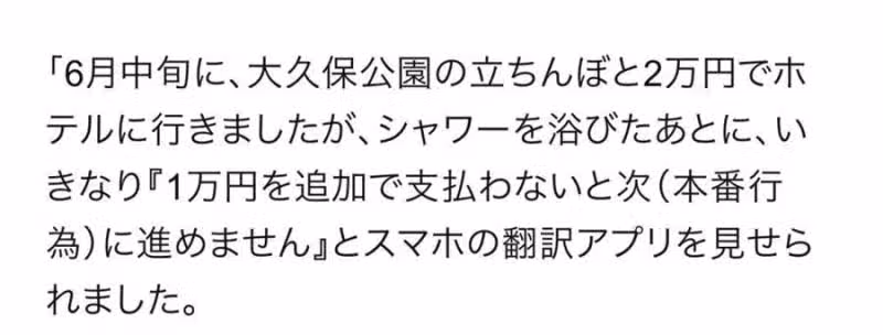 對於這件事,早紀表示之前聽說過不少站街女,會趁外國客人洗澡的時候偷偷將錢包里的錢偷走。由於這些外國人不會日語,去警察局報案也非常困難,「對我們來說,外國人是絕佳的肥羊」。