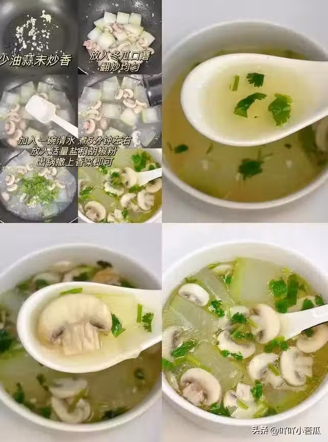 少油爆香蒜末時加兩粒花椒(去濕氣神操作),冬瓜口蘑炒軟後加開水。煮到湯變奶白色,連喝三天臉小一圈!香菜黨一定要多加,香味提升三個level!