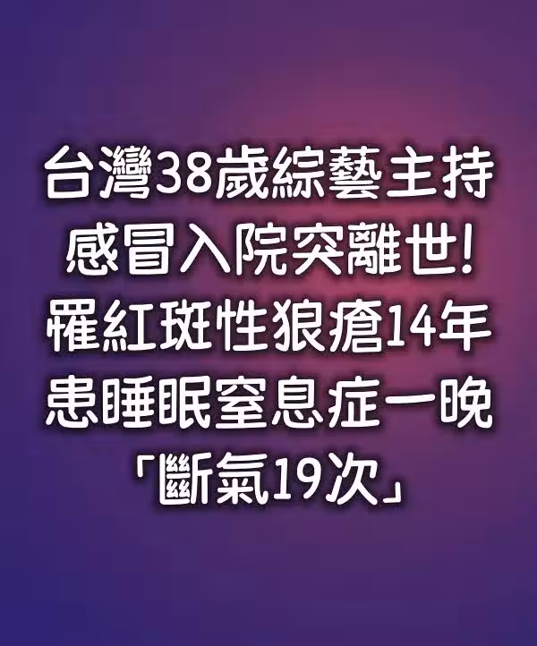 台灣38歲綜藝主持, 感冒入院突離世!罹紅斑性狼瘡14年 患睡眠窒息症一晚 「斷氣19次」