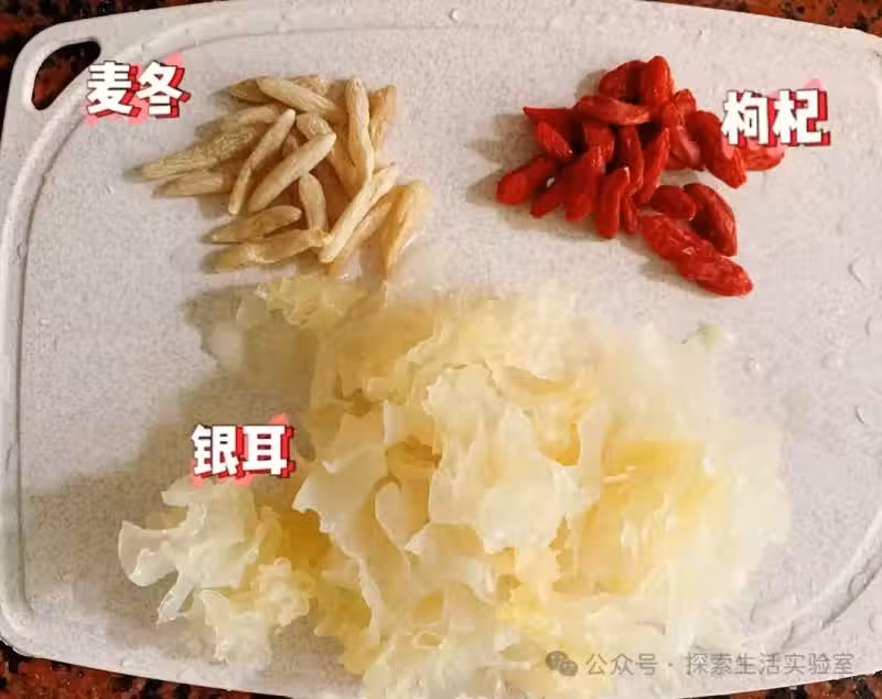麥冬15克、銀耳半朵、枸杞、冰糖適量