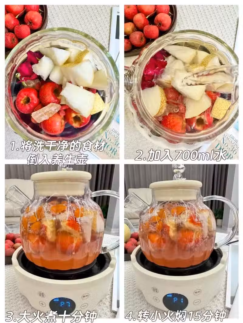 2.把所有食材倒入養生壺中,加入700-800毫升清水。大火煮十分鐘,轉小火燜15分鐘即可飲用。