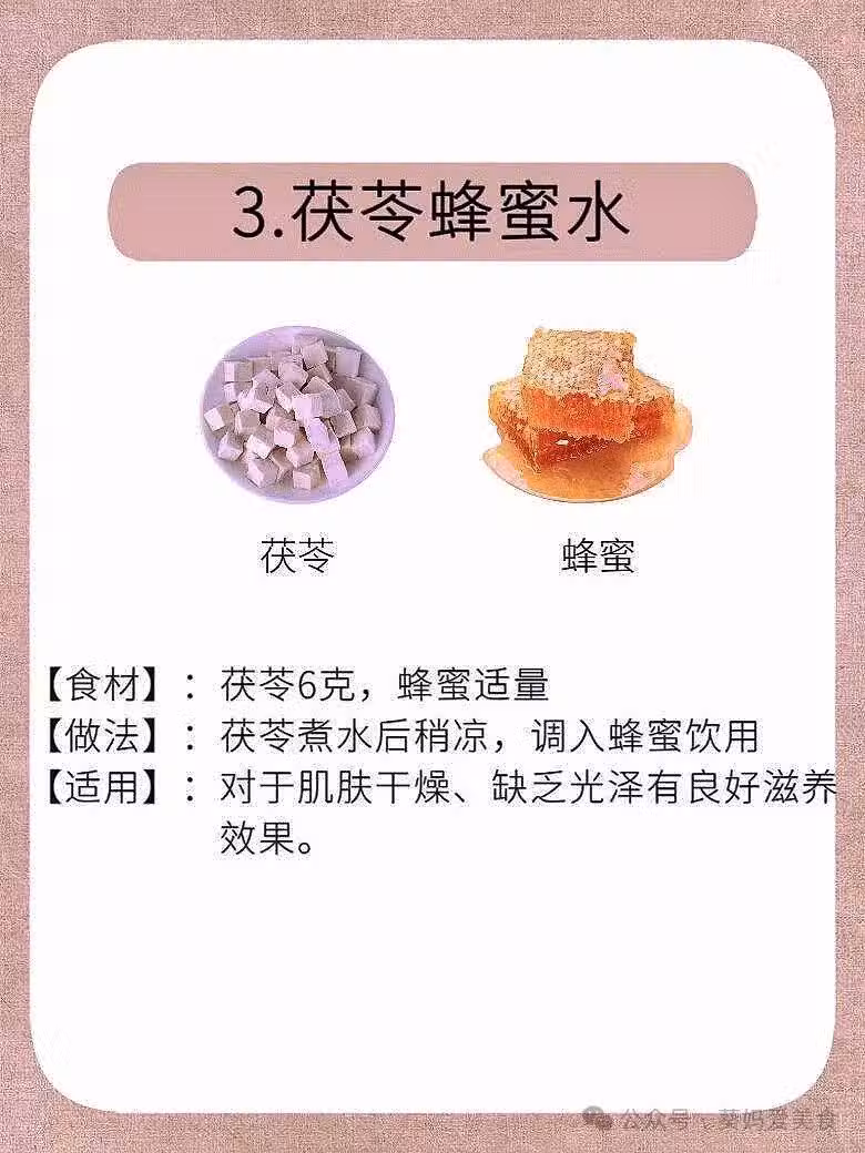 [做法] 茯苓煮水後稍涼,調入蜂蜜飲用 [適用] 對於肌膚乾燥、缺乏光澤有良好滋養效果。