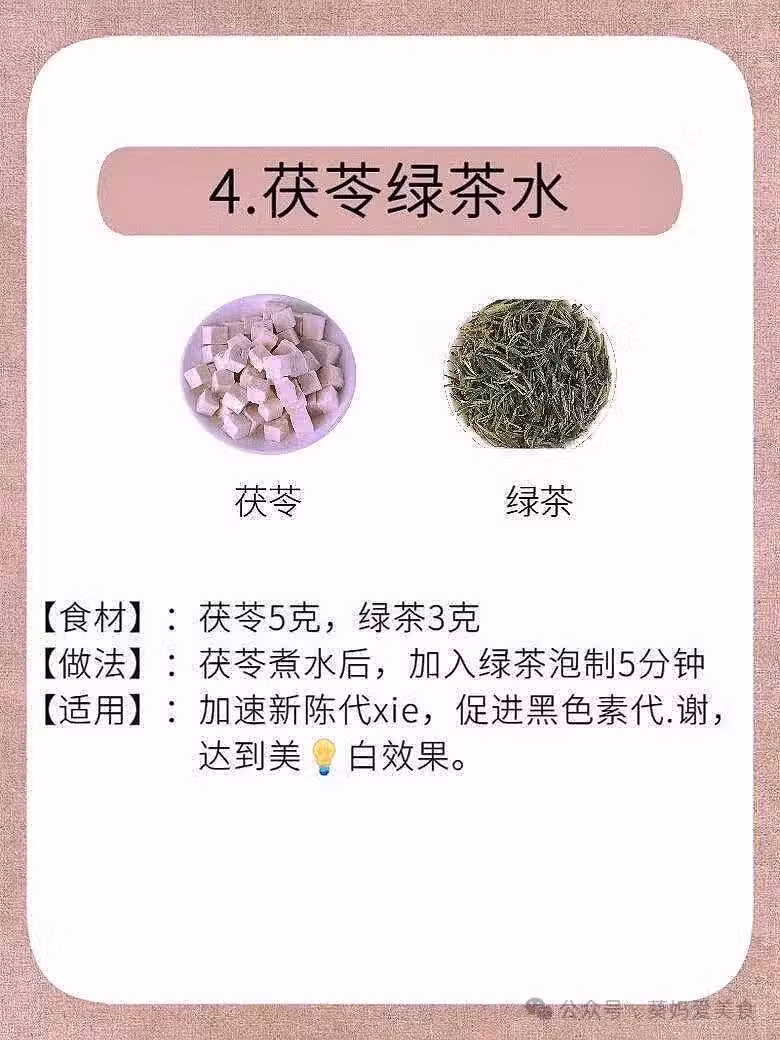 [做法] 茯苓煮水後,加入綠茶泡製5分鐘 [適用] 加速新陳代謝,促進黑色素代謝,達到美白效果。