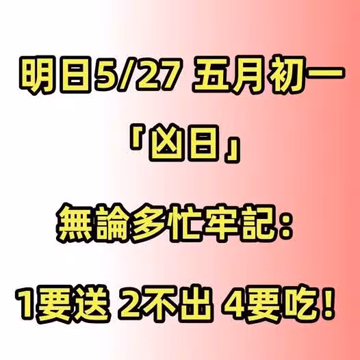 明日五月初一是「凶日」,無論多忙,牢記:1要送,2不出,4要吃!