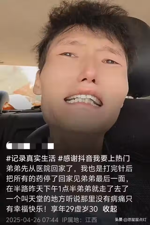可惜,天不從人願,弟弟國國病情惡化,上個月的4月25日病逝,走在了哥哥前面,年僅29歲。為此,小曾崩潰大哭。意想不到的是,時隔不到一個月,再次看到小曾、竟然是他去世的消息。更想不到,他的病情比弟弟國國惡化得更快,彌留之際時、瘦到剩皮包骨,一直處於肝昏迷狀態。