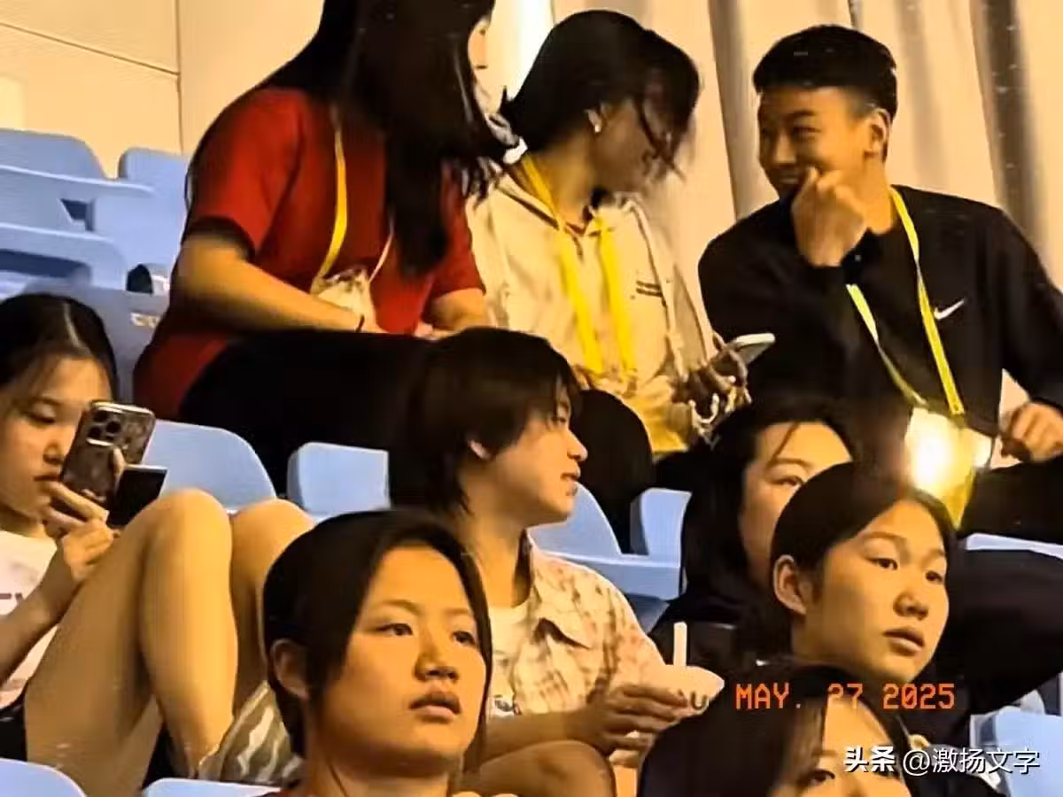 全紅嬋穿花格襯衣觀看比賽,坐在觀眾席上好像一名中學生