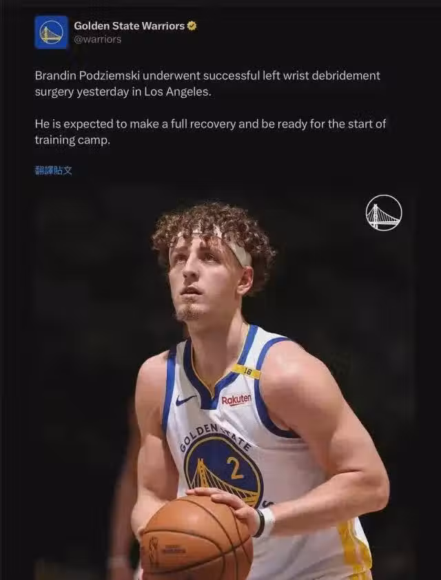 勇士官推:「波傑姆斯基近日接受了左手腕清創手術,預計將完全恢復,並為新賽季訓練營做好準備。」