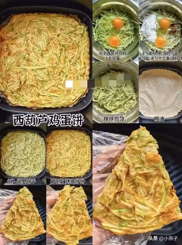 1. 西葫蘆切絲擠水,加蛋液、麵粉、調料拌勻成糊狀。