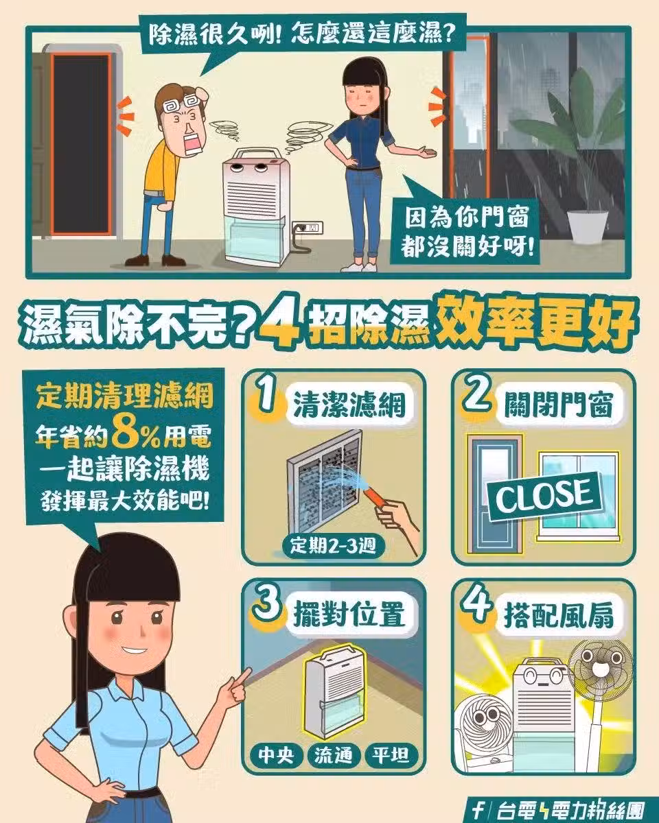 台電建議要定期清除除濕機濾網,可發揮最大效能同時省下電費。(圖/台電粉絲團)