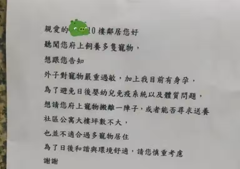 根據媒體《三立新聞網》、《TVBS》的報導,一名網友在臉書PO出一張公告,內容是一位鄰居寫給他的通知,對方表示自己的兒子因為對寵物嚴重過敏,再加上自己又懷孕,得知他家中飼養了不少寵物,擔心日後會對嬰幼兒體質和免疫系統造成影響,因此要求他將寵物搬離或送養,還強調「公寓大樓坪數不大,不適合過多寵物居住,為了日後和諧與環境舒適,請您慎重考慮!」
