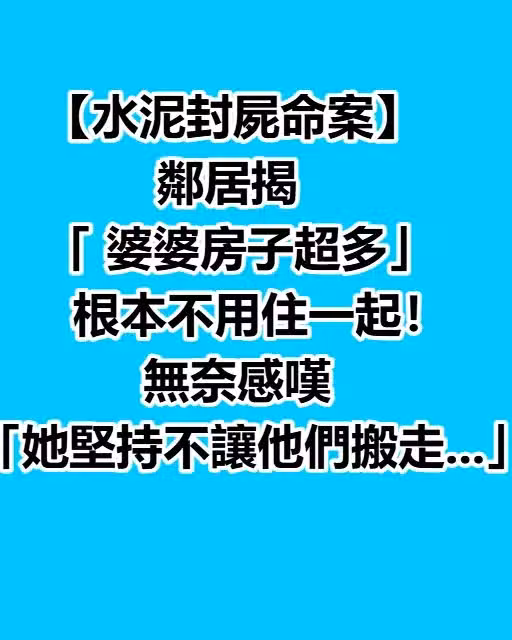 【水泥封屍命案】鄰居揭「婆婆房子超多」根本不用住一起!!無奈感嘆:「她堅持不讓他們搬走...」