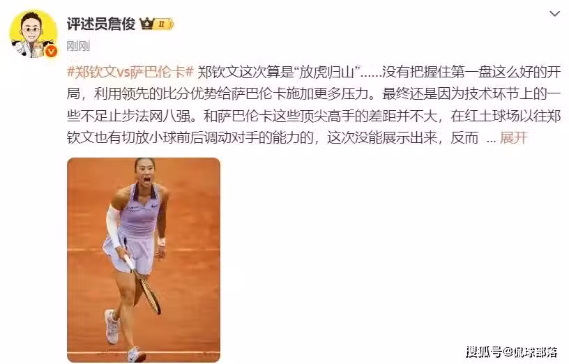 那麼鄭欽文到底輸在了哪裡?賽後第一時間,評述員詹俊進行了點評,表示鄭欽文沒有把握住第一盤這麼好的開局,最終因為技術環節上的一些不足止步法網八強,同時鄭欽文還需要在發球方面不斷提升。