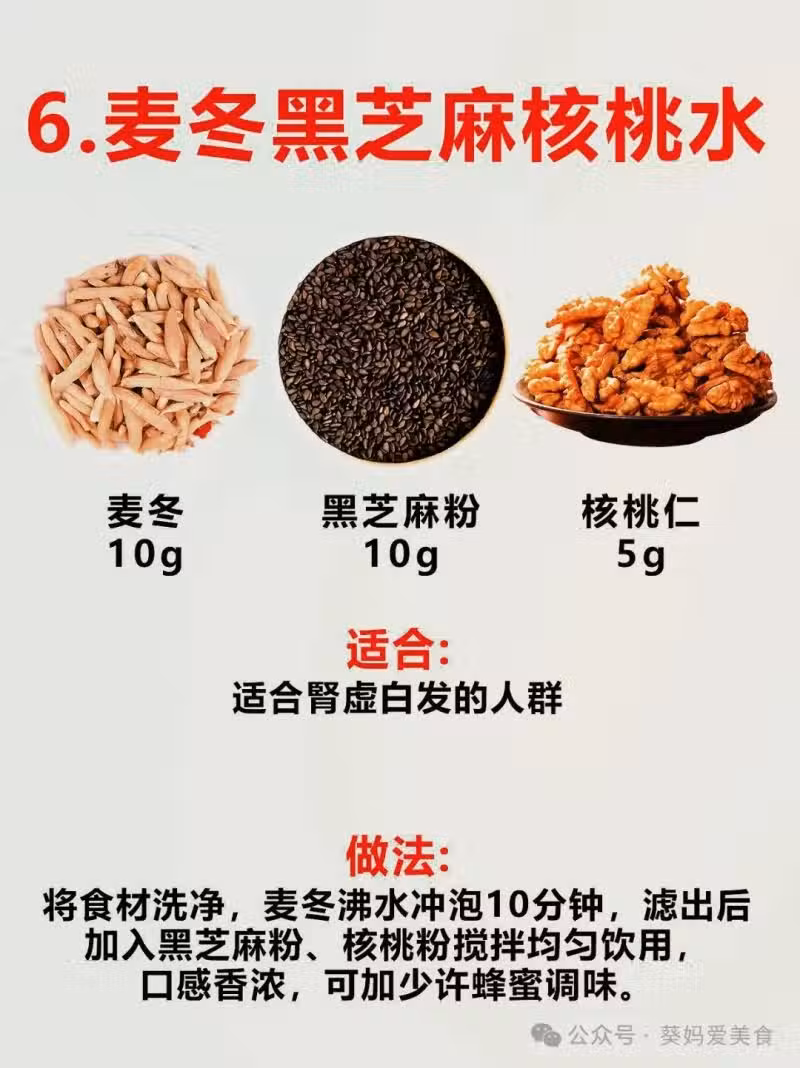 妥妥的「養發黃金搭檔」,核桃和黑芝麻都是養發的好東西,搭配麥冬一起喝,效果翻倍。