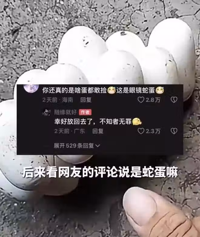 甚至有人勸男子搬家逃命:「這個蛇蛋已經沾上了你的氣味,後續眼睛王蛇會尋著氣味找到你,建議儘快多買點雄黃,撒在屋外」、「這是眼鏡王蛇的蛇蛋,這蛋它老媽根據氣味可以追15~30公里、能追幾個月,你快跑吧,小心大晚上的它爬你床頭看你睡覺!」雖然眼鏡蛇追蹤能力很強,不過這幾位網友的說法浮誇了。