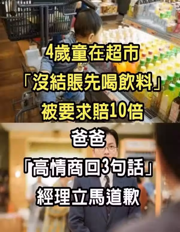 4歲童在超市「沒結帳先喝飲料」被要求賠10倍 爸爸「高情商回3句話...」經理立馬道歉