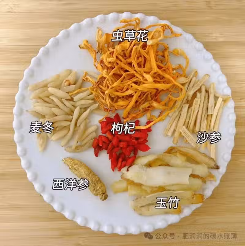 西洋參10g,沙參10g,玉竹10g,蟲草花15g,麥冬10g,