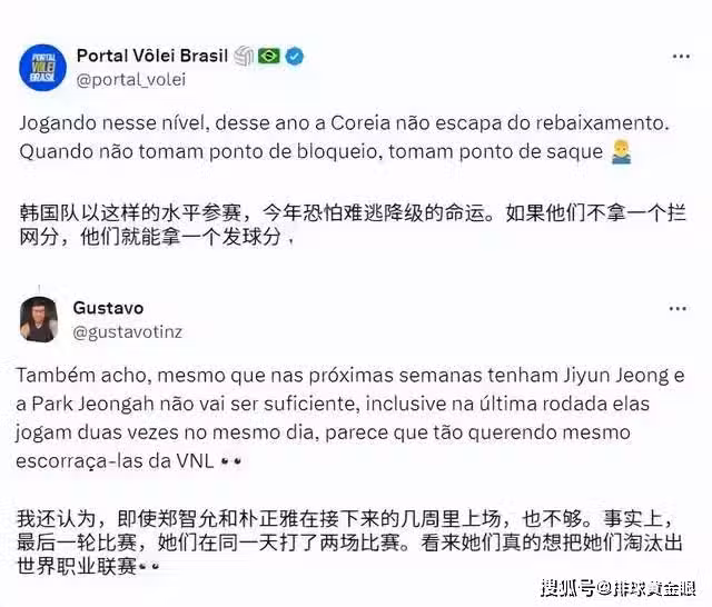 首場比賽結束後,巴西媒體更是直言,「韓國女排已露降級之象。」其實韓國女排在上周期就應該被降級,但由於她們是核心球隊,所以就算是30連敗也沒有一點降級的風險。巴黎周期,韓國女排曾遭遇過世聯賽30連敗,世界排名一路從十名之內跌至40名開外。24年世聯賽,韓國隊終於嘗到勝利的滋味,她們分別戰勝泰國和法國。