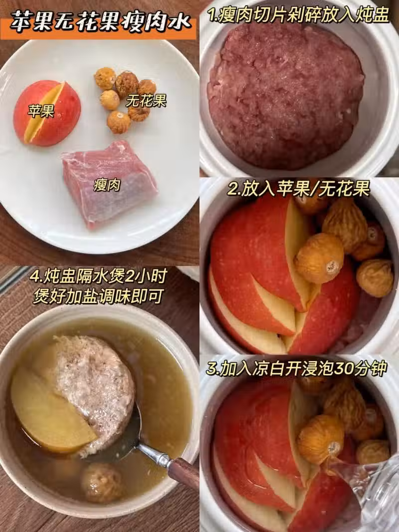 3️⃣ 燉盅里先鋪肉,再擺上蘋果塊和無花果。