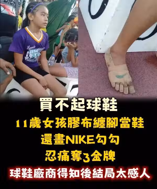 買不起球鞋,11歲女孩膠布纏腳當鞋,還畫NIKE勾勾忍痛奪3金牌,球鞋廠商得知後,結局太感人...