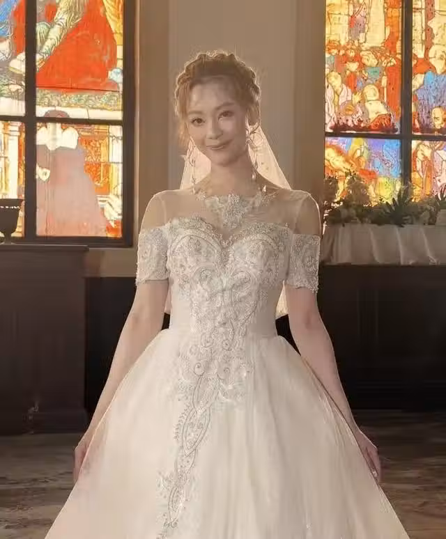 只見照片中的葉蒨文打扮的很美,穿著露肩婚紗,戴著頭紗,妝容看起來也是非常自然,和之前相比她似乎瘦了不少,不知道是否有刻意減肥。
