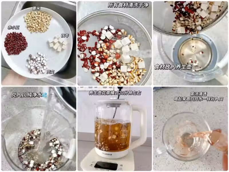 薏米一小把(提前干鍋小火炒至微黃,去寒性)、芡實、茯苓、赤小豆各適量(注意是細長的赤小豆,不是圓的紅豆)