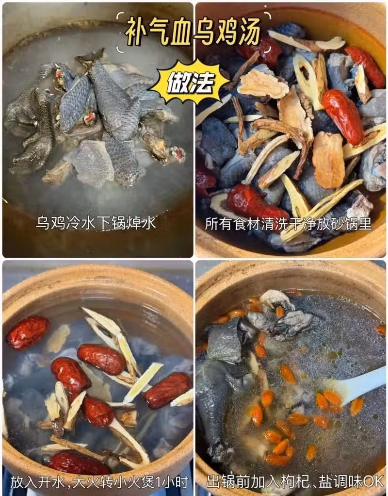 烏雞、薑片、黨參、當歸、紅棗、黃芪、枸杞