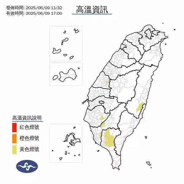 中央氣象署提醒,今天 (9) 各地普遍高溫32~34度,彰化縣、台南市、高雄市、屏東縣、花蓮縣中午前後有機會達36度或以上。