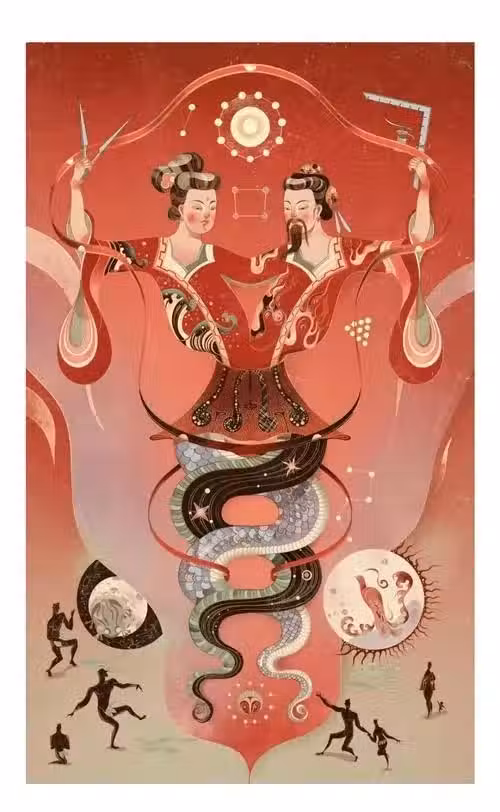 更有意思的是,他們往往手持「規與矩」,象徵規則與衡量。這對「夫妻兄妹」,坐在時間軸起點,展示給觀者的不是家庭生活,而是秩序起點。他們的存在,是一份社會契約的隱喻:在天地混亂之後,總要有一套系統讓人類「合法」生存。