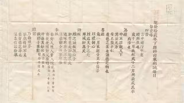 1747年丁卯科,山東文舉第一場考經義,試四書經義三道、五經經義四道,以八股文的格式解釋四書五經的經義。