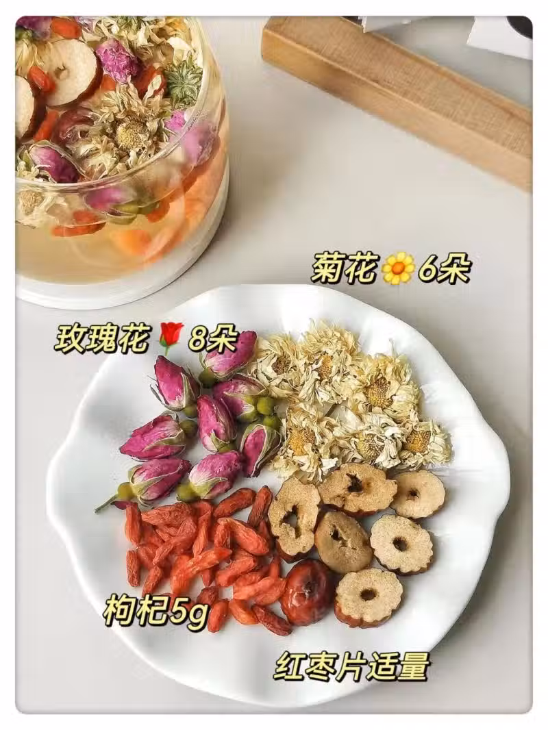玫瑰花8朵|菊花6朵|枸杞5g|紅棗片適量