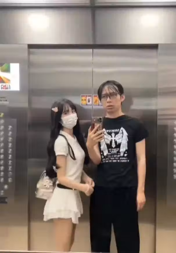 這對情侶喜歡在電梯里拍照,對著鏡子擺姿勢,這已經成為他們的特色。