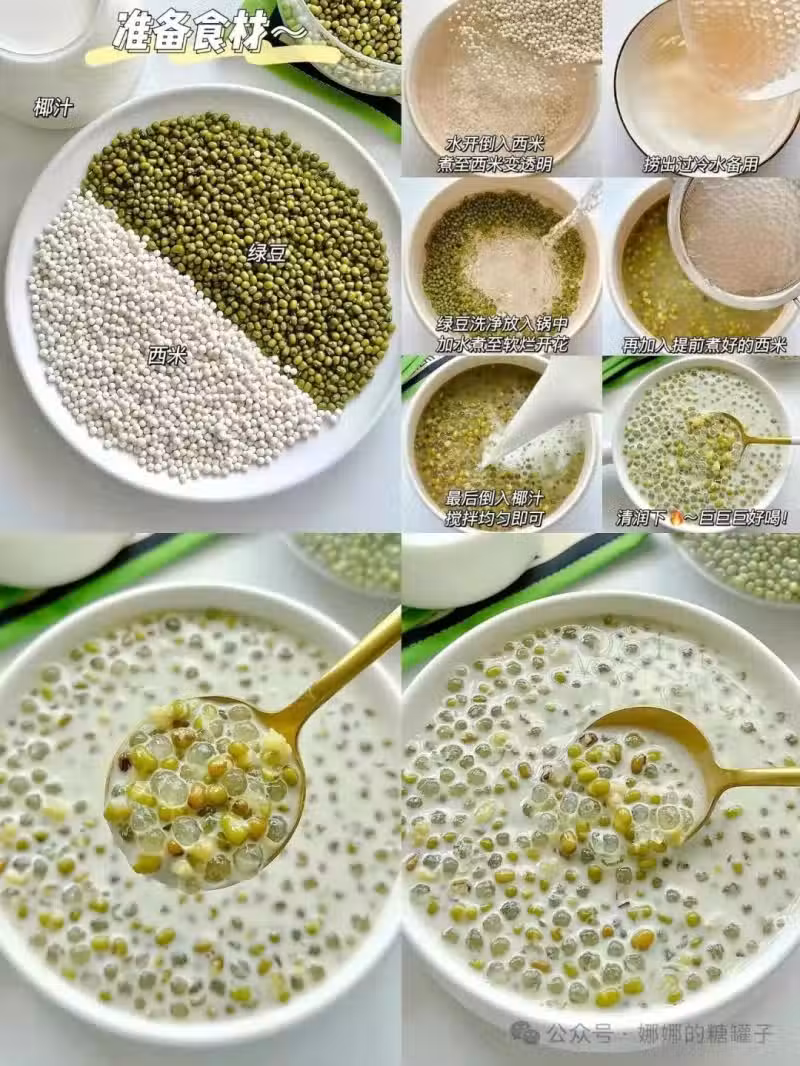 做法: 1.泡發綠豆:將綠豆洗凈,放入碗中,加入足量清水,浸泡4—6小時,直至綠豆體積膨脹,表皮微微裂開。泡發後的綠豆更容易煮熟煮爛,節省烹飪時間。 2.煮綠豆:把泡好的綠豆瀝干水分,放入鍋中,加入約1000毫升清水,大火煮開後轉小火慢煮30—40分鐘。期間適時攪拌,防止粘鍋。當綠豆煮至軟爛,湯汁變得濃稠,加入冰糖,攪拌至冰糖完全融化。 3.煮西米:另起一鍋,加入足量清水,大火燒開後倒入西米,不斷攪拌,防止西米粘連。煮10—15分鐘,至西米中間只剩一個小白點時,關火燜5—10分鐘,直至西米完全透明。將煮好的西米撈出,過涼水,這樣可以讓西米更加Q彈有嚼勁。 4.混合搭配:將煮好的綠豆湯和西米混合在一起,根據個人口味加入適量椰奶或牛奶,攪拌均勻。一碗香甜可口、Q彈爽滑的綠豆西米露就完成啦!冷藏後飲用,口感更佳,椰奶的香氣與綠豆的清甜相互交融,給你帶來雙重享受!