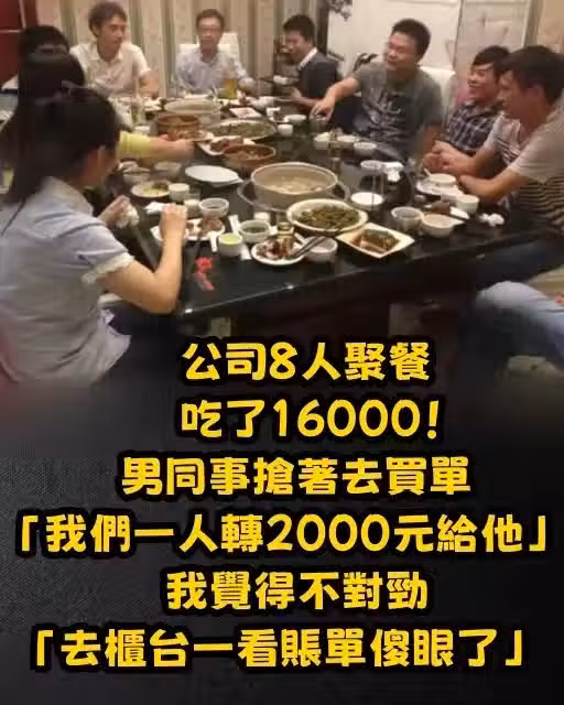 公司8人聚餐吃了16000! 男同事搶著去買單「我們一人轉2000元給他」,我覺得不對勁「去櫃檯一看帳單傻眼了」