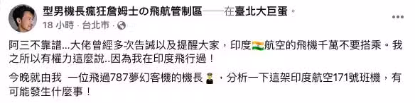 詹姆士感嘆,印度航空的飛機維護可能存在人為疏失,或許是釀成事故的關鍵因素,「還記得大佬過去多少次警告大家,不要搭印度航空!現在一語成讖!」
