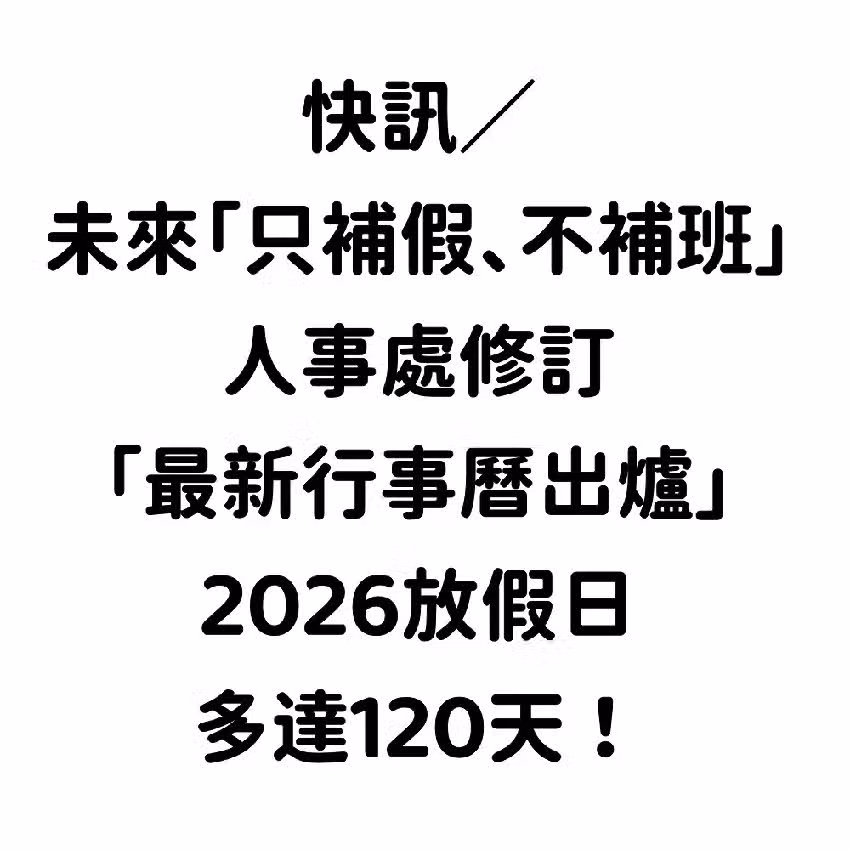 快訊/未來「只補假、不補班」!人事處修訂「最新行事曆出爐」:2026放假日多達120天