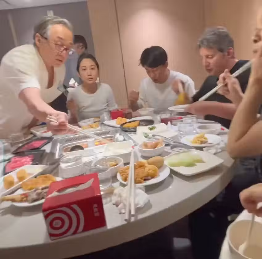 雖然外表顯老,但成龍依然精神矍鑠,胃口也不錯,桌子上點了好多盤肉,大哥戴著老花鏡正夾肉呢!