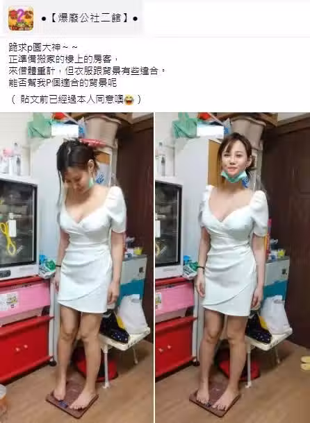 日前男網友在臉書社團「爆廢公社二館」指出,樓上的房客準備搬家,到他家敲門借體重計,他隨手拍下2張照片,不過照片的背景有點凌亂,因此詢問有沒有P圖大師可以幫他P個合適的背景呢?