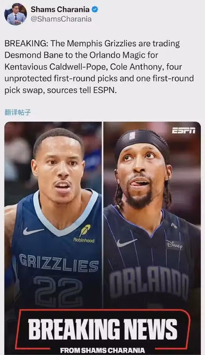 爆料王Shams:灰熊將貝恩交易至魔術,換回波普+科爾-安東尼+4個不受保護的首輪簽+一個首輪簽互換權。