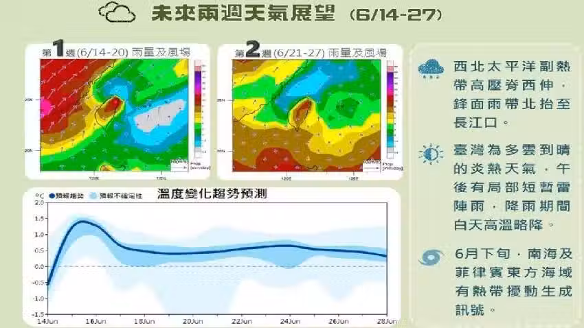 賈新興進一步預測,周三(18日)午後,彰化以北及宜有局部短暫陣雨, 南投以南亦有零星短暫雨。