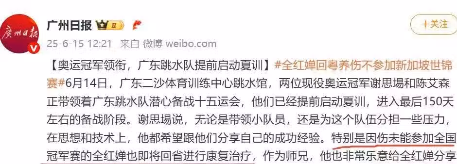 無緣世錦賽!全紅嬋再次因傷退賽,回省隊治療,師哥的話令人淚目