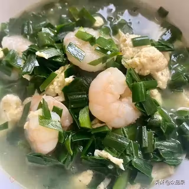 3.水開後放入蝦仁和韭菜段,煮2分鐘,蝦仁變紅、韭菜變軟即可。