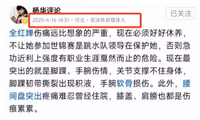 儘管評論區偶有質疑之聲,但全紅嬋本人並未過多在意,而是專注於自身的恢復與訓練。據這位媒體人透露,全紅嬋的傷病不僅限於之前公開的腳踝傷,其手腕、腰部、肩膀及膝蓋等多處均存在不同程度的損傷。這些傷痛對她的身體造成了不可逆的影響,也讓她在日常訓練中承受了巨大的痛苦。因此,領導決定不讓她參加世錦賽,實際上是為了保護她的健康。這一決定體現了對運動員的人文關懷,也讓我們更加珍惜全紅嬋在賽場上的每一次精彩表現。