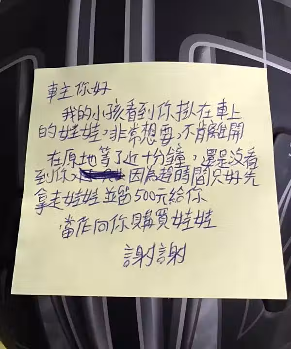 這天,他像往常一樣停好車去吃飯,回來時卻發現后座原本放著的皮卡丘玩偶不翼而飛,只在油箱蓋上發現了一張紙條和空蕩蕩的夾子「車主你好,」紙條上的字跡歪歪扭扭,卻寫得十分認真,「我的小孩看到你掛在車上的娃娃,非常想要,不肯離開,在原地等了近10分鐘,還是沒看到你,因為趕時間只好先拿走娃娃,並留500元給你,當作向你購買娃娃,謝謝!」