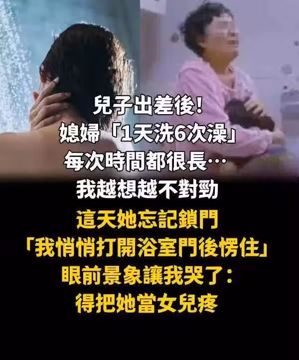 兒子出差後!媳婦「1天洗6次澡」每次時間都很長… 我越想越不對勁,這天她忘記鎖門「我悄悄打開浴室門後愣住」眼前景象讓我哭了:得把她當女兒疼...
