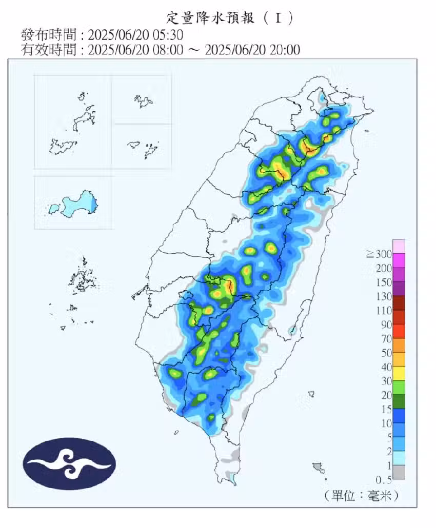 降雨部分,氣象署指出今、明 (20、21) 兩天台灣各地及澎湖、馬祖大多為多雲到晴,僅東南部地區及恆春半島有零星短暫陣雨,金門有局部短暫陣雨或雷雨;今日午後南投、嘉義以南、大台北地區及其他山區有局部短暫雷陣雨。