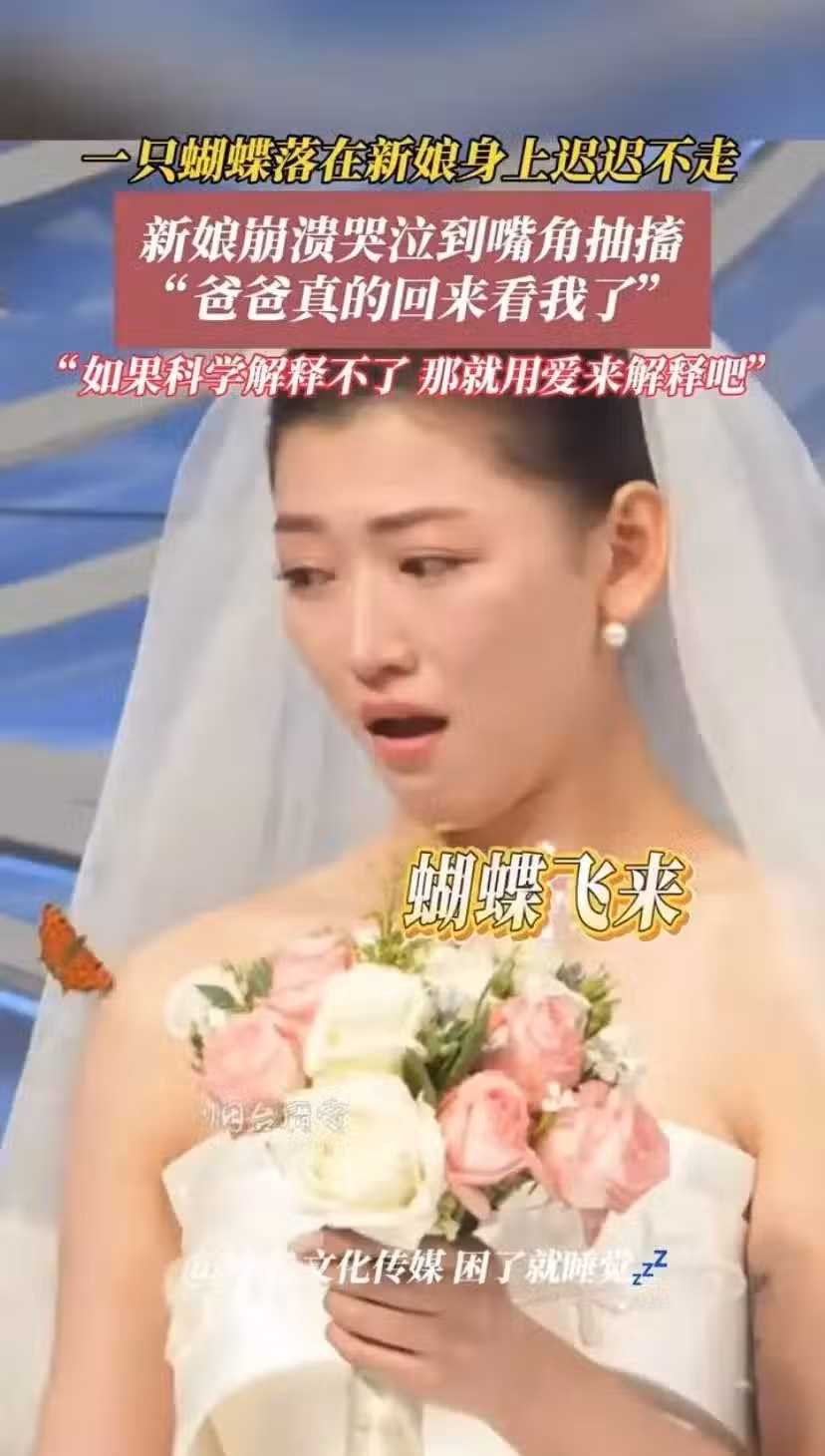 剛才還在一直笑著的新娘瞬間淚崩,嘴角不停地抽動,在這個場合她強忍著淚水,不讓自己哭出聲。不停的左右看著在自己面前飛來飛去的胡蝶,她心理在默默的念叨著,爸爸真的來看我了,知道我今天結婚。站在一旁的新郎也是默默的看著這隻胡蝶,不敢去驅趕,此時此刻他懂得新娘在想什麼。