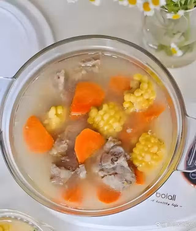 4. 加入清水或雞湯:向鍋中加入適量的清水或清雞湯,水量以能覆蓋所有食材為宜。大火煮沸後,轉小火繼續燉煮10分鐘,直到胡蘿蔔變軟。
