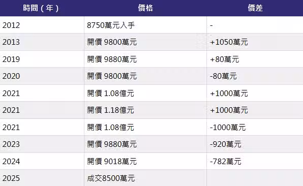 該物件自2013年起就開始掛網求售,期間經歷多次價格調整,從最高喊價1.18億元到最終8500萬元成交,總計167.29坪的豪宅,單價降至5字頭。