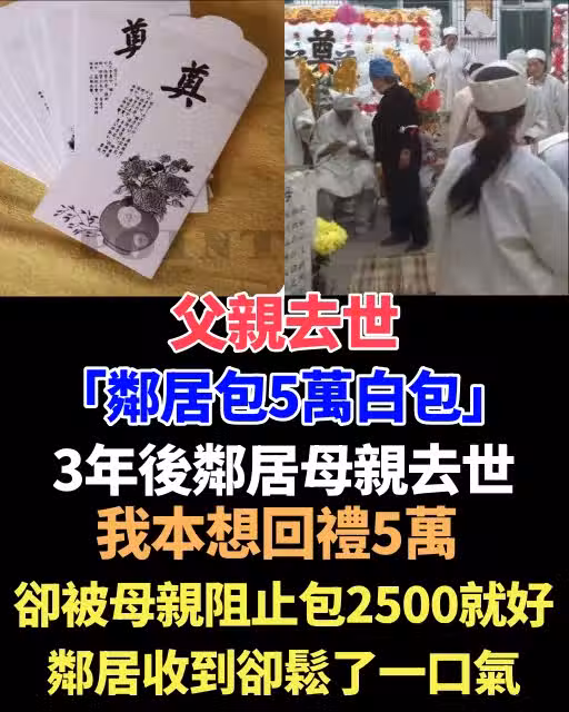 父親去世「鄰居包5萬白包」!3年後鄰居母親去世,我本想回禮5萬,卻被母親阻止「包2500就好」鄰居收到卻鬆了一口氣!