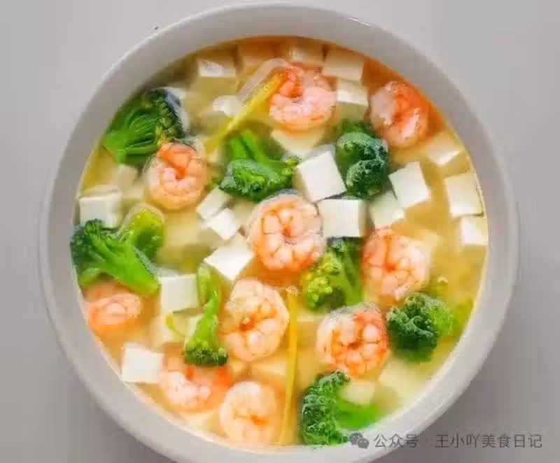 做法:蝦仁洗凈料酒腌10分鐘,西蘭花洗凈切小朵蝦頭下鍋煎至金黃酥脆,留底油,加熱水放入西蘭花、蝦仁、豆腐,煮3分鐘,調味出鍋。